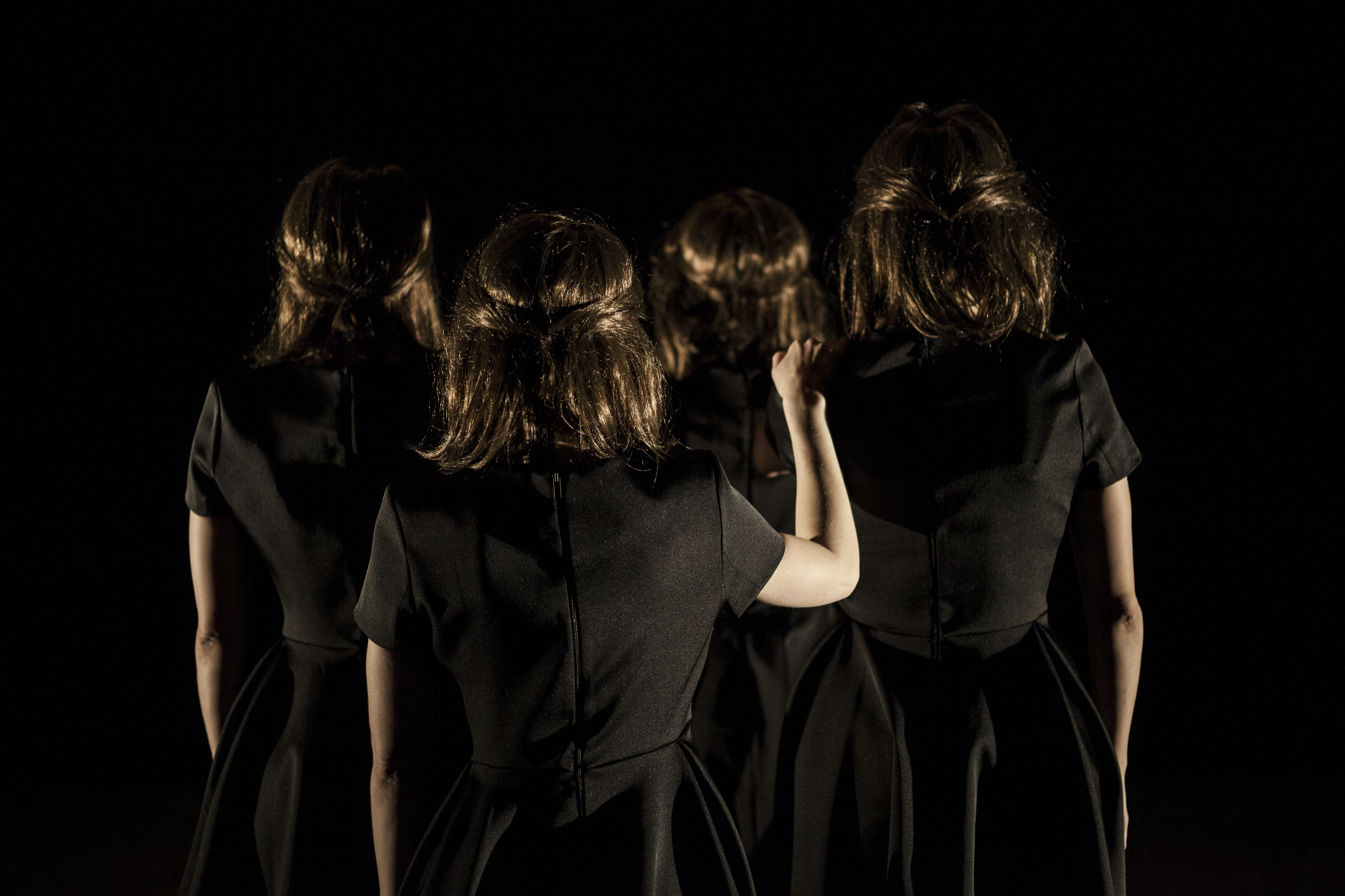 The intensity is high, when Itamar Serussi conjures an emotionally charged atmosphere as in a film noir. A fragmented universe where four women dressed in black are witnessed in a bodily momentum between the last moments of life and the journey towards the unknown. With his intuitive approach to composition and an imaginary, sensational world, Serussi explores each dancers personality and highlights Fanclub specific group dynamics. The Dutch composer Richard van Kruysdijk stand behind the music for the performance, creating moments of uncomfortable dissonance, rocking peace and devotion.